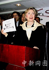 紐約州聯(lián)邦參議員希拉里. 克林頓五日到訪紐約華埠,手舉“支持亞洲餐館”的標語,支持華埠商家。中新社記者 趙海燕 攝