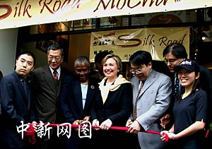 紐約州聯(lián)邦參議員希拉里·克林頓五日到訪紐約華埠,與社區(qū)人士探討振興華埠議題,澄清“非典”謠言,并按照中國傳統(tǒng)方式為新張的“絲路”咖啡屋剪彩。中新社記者 趙海燕 攝