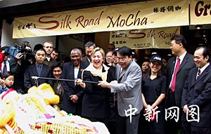 紐約州聯(lián)邦參議員希拉里·克林頓五日到訪紐約華埠,與社區(qū)人士探討振興華埠議題,澄清“非典”謠言,并按照中國傳統(tǒng)方式為新張的“絲路”咖啡屋剪彩。希拉里右邊為咖啡屋老板蔡政存。中新社記者 趙海燕 攝