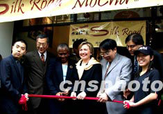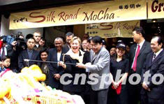 紐約州聯邦參議員希拉里.·克林頓五日到訪紐約華埠,與社區人士探討振興華埠議題,澄清“非典”謠言,并按照中國傳統方式為新張的“絲路”咖啡屋剪彩。(希拉里的右邊為咖啡屋老板蔡政存)中新社記者:趙海燕