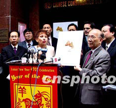 美國會議員維拉貴茲五日站在勿街中華公所門前舉起當日出版的《每日新聞》報上登出的一條宣傳華埠沒有“非典”的公益廣告說,華埠是安全的,人們可以放心地到華埠來。(右一為中華公所主席伍廷典)中新社記者:趙海燕