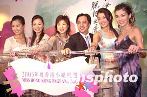 "2003年度香港小姐競選"9日在香港舉行記者會,應(yīng)屆港姐冠軍林敏俐(右二)、亞軍左慧琪(右一)、季軍胡家惠(左三)等與港姐競選統(tǒng)籌經(jīng)理何麗全攜手主持本地招募宣傳片啟播儀式。鄧慶樂 攝