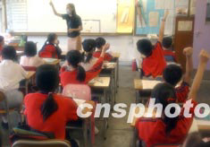隨著香港“SARS”疫情的逐漸穩定,香港數百所小學的高年級學生五月十二日開始復課。在灣仔學校復課的第一天,老師向學生提問有關如何防預“SARS”的基本知識。中新社記者 錢興強 攝