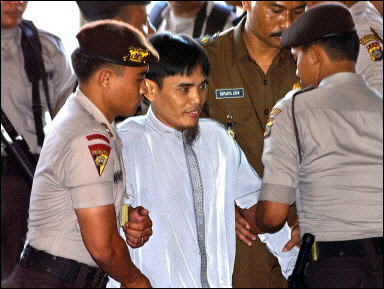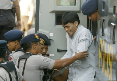 印度尼西亞度假勝地巴厘島2002年10月受到爆炸攻擊,造成200喪生,死者大部分為外籍人士。巴厘法院2003年5月12日傳喚爆炸案主嫌阿姆魯濟(jì),正式展開本案的審理程序。圖為阿姆魯當(dāng)天上午在重重警力包圍下,抵達(dá)法院出庭。