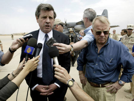新任美國駐伊拉克行政長官布雷默(左)12日飛抵伊拉克巴格達(dá)機場,正式到職就任。布雷默將接替前美國將軍加納,負(fù)責(zé)監(jiān)督伊重建工作與政治重組。圖為布雷默當(dāng)天在巴格達(dá)機場接受媒體訪問。