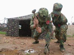在昨日的演練中,官兵們集中演習了野外照明修理所、夜間照明、防洪子堤構筑、植樁機植樁以及水上探險等5大軍事課目。記者在現場看到,這5大項目緊密相連,整個過程的完成沒有超過30分鐘,卻形成了一套非常穩固的防洪搶險“屏障”。此外,該團官兵還實地演練了水上救險、水上打撈以及裝卸載等課目。在50米范圍的水域內,如發現有人落水,沖鋒舟進行成功救助,只需短短幾分鐘時間。