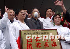 身染“非典”的著名電影導演謝飛經(jīng)過二十多天的治療,十六日從北京地壇醫(yī)院康復出院前與大夫們合影留念。中新社記者:武仲林