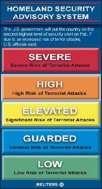 中新網5月21日電 美國國土安全部20日宣布,將全國安全警戒級別從五級彩色預警系統中的中間級別黃色提高到次高級別橙色。