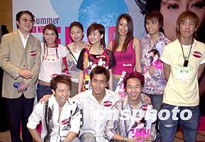 歌星黃伊汶5月21日在香港舉行新歌MV〔戒男〕首播禮,環(huán)球唱片高層陳小寶(左一)率領(lǐng)旗下眾歌星出席為黃伊汶打氣造勢(shì)。鄧慶樂(lè) 攝