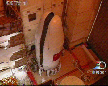 衛星發射前,科研人員進行衛星與火箭的總裝。(以上均為CCTV圖)