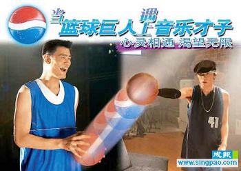 中新網5月30日電 與去年一樣,今年百事夏季頭炮電視廣告同樣由周杰倫領航,這次他會與籃球明星姚明合作,兩人通過音樂及籃球,釋放出前所未有的火花。