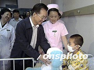 溫家寶來到11歲的湖南女孩許碧玉的病床前,關切地詢問病情和家庭情況,鼓勵她堅定戰勝疾病的信心,叮囑醫護人員要精心治療和護理,讓孩子們早日康復。