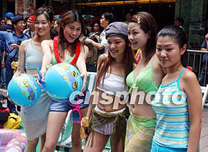 為刺激消費市道和營造復(fù)蘇氣氛,香港從六月八日起在灣仔駱克道舉行星光之夜活動。圖為數(shù)十名模特穿上泳裝在街頭巡游。潘索菲 攝