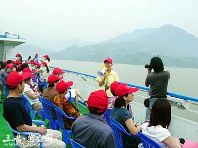 九點二十時,三輛豪華大巴緩緩駛進秭歸港。車剛停住,第一批一百多名頭帶紅帽的三峽高峽平湖游客,就急急走出汽車,不停地舉起手中的相機。冰凍了近兩個月的三峽旅游在一片閃光燈中解凍。