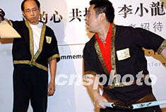 為紀念國際巨星李小龍逝世三十周年,六月十四日香港舉行「龍的心、共抗炎,李小龍慈善珍藏電話卡公開發行」活動。圖為李小龍弟子為賓客演示雙節棍。錢興強 攝