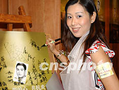 曾獲香港國際親善小姐稱號的殷莉,六月十四日出席在香港舉行的「龍的心、共抗炎,李小龍慈善珍藏電話卡公開發行」活動。錢興強 攝