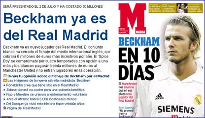 報道指出,雖然貝克漢姆目前與曼聯尚有兩年的合同,但是他現在已經是身在曹營心在漢。他希望加盟皇馬,已經是“地球人都知道”的秘密;蜀R也希望得到貝克漢姆來增加人氣,這也是眾所周知的。