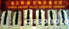 十七日下午,美國國土安全部移民與海關執法局的官員將六件西漢陶俑交送到中國駐紐約總領館,這六件神態各異的陶俑來自二00一年被盜的中國陜西西安西漢竇皇后墓,經過中美兩國執法部門一年多的合作終于在十七日歸還中國政府。
