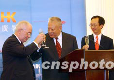 香港特首董建華、財政司長梁錦松及投資推廣署長盧維思,6月24日在禮賓府特設酒會,舉杯祝賀來港投資的中外企業代表在港開業擴充業務。 中新社記者 洪少葵