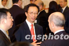 香港財政司司長梁錦松,6月24日在禮賓府特設的酒會上,與六家在香港新設或擴充業務的海外投資商交談甚歡。 中新社記者 洪少葵