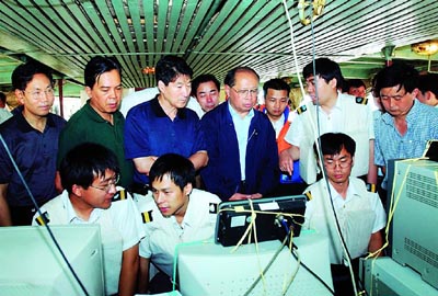 黃鎮(zhèn)東與市委常委、秘書長(zhǎng)何事忠,副市長(zhǎng)吳家農(nóng)、趙公卿一道,馬不停蹄地乘船趕赴現(xiàn)場(chǎng)。在船艙內(nèi),黃鎮(zhèn)東同國(guó)家安全生產(chǎn)監(jiān)督管理局副局長(zhǎng)閃淳昌等國(guó)務(wù)院事故調(diào)查組同志一道,認(rèn)真聽(tīng)取了事發(fā)經(jīng)過(guò)、施救情況和善后安排等情況的匯報(bào),并對(duì)下一步探測(cè)打撈工作提出了要求。黃鎮(zhèn)東一行還登上正在緊張作業(yè)的打撈船,看望慰問(wèn)探測(cè)打撈人員,對(duì)大家?guī)滋靵?lái)連續(xù)緊張的工作給予了肯定。在作業(yè)臺(tái)前,黃鎮(zhèn)東詳細(xì)詢問(wèn)了打撈公司的裝備、事故地點(diǎn)的水文特征、探測(cè)作業(yè)的最新進(jìn)展等,并要求探測(cè)單位鎖定重點(diǎn)水域進(jìn)行加密探測(cè),盡快確定沉船位置。打撈公司則要進(jìn)一步熟悉水情,科學(xué)論證,縝密部署,迅速制訂打撈方案,在確保安全前提下實(shí)施沉船打撈。他還特別叮囑要注意在打撈和搜尋中的安全,確保整個(gè)搜救工作萬(wàn)無(wú)一失。