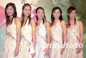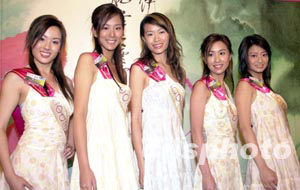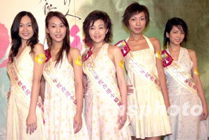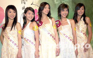 「2003年香港小姐競選」6月26日舉行「鉆石肌膚獎」記者會,二十位候選佳麗再度亮相,圖為11─15號候選佳麗,楊洛婷、吳幸美、詹德貞、鄧源慧、陳榕梅 (左起)。 中新社記者 鄧慶樂