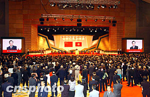 溫家寶總理專程從北京來香港,出席內地與香港更緊密經貿安排的簽署儀式和特區政府舉行的周年酒會。溫總理來港兩天,風塵仆仆,所到之處,讓市民們真切感受到了新一屆中央政府的關懷和支持。讓我們用熱烈的掌聲,向胡錦濤主席、溫家寶總理、向中央政府,表示最衷心的感謝!