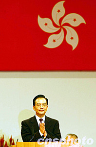 溫家寶說∶今天是香港回歸祖國六周年的喜慶日子。在香港萬眾一心戰勝SARS、奮力重振經濟的重要時刻,我代表中央政府和全國各族人民,向香港特別行政區政府、香港同胞和各界人士表示熱烈祝賀和良好祝愿。