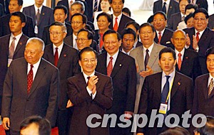在樂聲、掌聲中,溫家寶等主要嘉賓在主席臺就坐。他的背後墻壁上懸掛著鮮艷的國旗和區旗。
