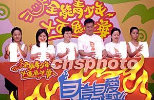 香港「2003年青少年暑期活動(dòng)」7月2日舉行記者會(huì),民政事務(wù)總署署長陳甘美華(左三)、與青少年暑期活動(dòng)委員會(huì)主席陳振彬(左四)等人與活動(dòng)大使Twins蔡卓妍(右一)及鍾欣桐(左一)攜手主持揭幕亮燈儀式。鄧慶樂 攝