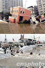 上海軌道交通4號線滲水事故現場,三日下午一點三十分左右又出現新險情,早上才由武警部隊官兵筑起的第二道圍堰,由于遇到黃浦江漲潮,突然垮塌約十五米,當時在施工中的十余名武警官兵,全部被水沖到十余米以外。中新社圖