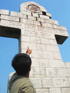 這座由沙俄建立的紀念碑呈十字架形,高6米,寬0.7米,以灰白色花崗巖砌筑,碑的上端鑲嵌著圓形彩色“圣母”頭像,下面鐫刻著俄文。日期為1904至1905年,即“日俄戰爭”的時間。