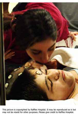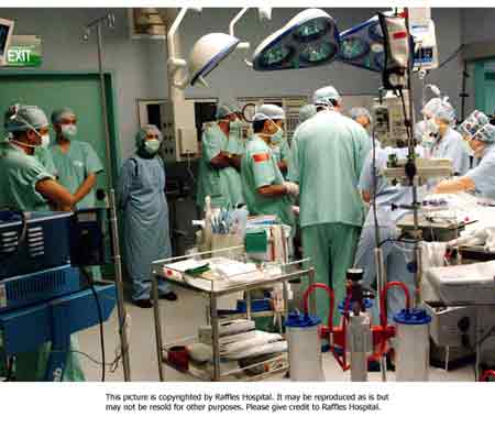 中新網7月6日電 新加坡萊佛士醫院新聞發布室7月6日消息,今天是伊朗連體姐妹“分首”手術的第一天,手術的現場情景如下:圖一是手術室里醫院們正在為姐妹做手術;圖二為進行手術前熱情的伊朗人為姐妹祝福;圖三為手術室忙碌的情景。(徐冰川/聞新芳)