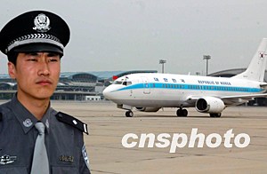 韓國總統盧武鉉七日乘專機飛抵北京開始其訪華行程,機場人員加強警戒確保安全。中新社記者:滿會喬