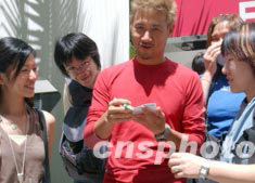 香港歌星張學友,七月十二日接受香港新城電臺“家天下”節目專訪,等候的歌迷爭相請張學友簽字。中新社傳真 錢興強 攝