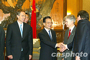 今天中午,中國總理溫家寶與來華訪問的英國首相布萊爾,在人民大會堂東大廳共同會見了英方隨行企業(yè)家。面對滿座英國的生意經(jīng)高手,擅長用數(shù)字說明問題的溫家寶顯然遇到了“知音”。