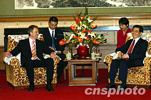 中國國家主席胡錦濤二十一日在北京會見英國首相布萊爾。中新社記者:滿會喬