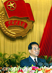 中共中央政治局常委吳官正二十二日在北京向中國共青團十五大致祝辭。中新社記者:滿會喬