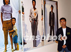 “香港藝術(shù)雙年展2003”,七月二十二日在香港藝術(shù)館舉行新聞發(fā)布會,此次展覽共收到1500多件參賽作品,最后評選出十個(gè)優(yōu)秀獎(jiǎng)。圖為胡健一向賓客介紹他的攝影作品《游人》。中新社記者:錢興強(qiáng)