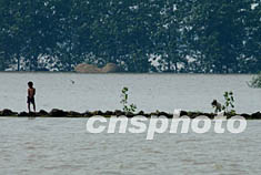 中國(guó)安徽省今夏發(fā)生近五十年最嚴(yán)重的淮河洪水,前兩次洪峰因及時(shí)分洪而去,但第三次洪峰正在形成。圖為穎上縣的洪水與行洪區(qū)連成一片,土堤上的孩子和小狗處境堪憂(yōu)。中新社記者:賈國(guó)榮