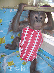 圖:珍稀動物紅毛猩猩空調屋里躲避酷暑