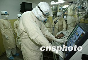 北京一名病程達89天、年近六旬的男性SARS患者,7月26日中午經北京市首席SARS醫療專家王辰(前)等搶救無效死亡。目前,北京尚有12名住院SARS患者,經專家組近日會診,絕大多數患者的SARS病癥已經痊愈,沒有傳染性,困擾他們的是其他基礎病。中新社記者:任晨鳴