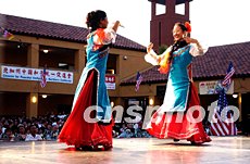北加州華人運動會好時威之夜頒獎晚會七月二十六日晚在美國圣荷西市舉行,生活在美西灣區(qū)的華裔演藝人士為頒獎晚會獻上了精彩的演出。圖為中華演藝學(xué)院的學(xué)員表演蒙族舞《情思》。作者:陳鋼