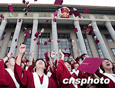 北京中加學校2003畢業典禮八月二日在北京人民大會堂舉行,三百一十一名高中學生及三十六名BTM、IHM專業的學生畢業,高中畢業學生報考外國大學的升學率達到百分之百。圖為畢業的學生們在人民大會堂外歡呼慶祝。中新社記者:毛建軍