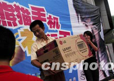 面對外國手機雄霸中國大城市的現狀,一些國產手機避開峰頭選擇在中小城市推銷。國產熊貓手機銷售商夏季在陜北延安市百貨大樓前搭起有獎促銷臺。中新社記者:王麗南