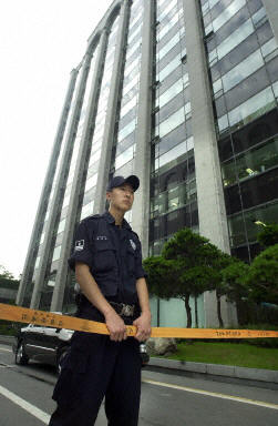 韓國(guó)現(xiàn)代集團(tuán)峨山公司董事長(zhǎng)鄭夢(mèng)憲在漢城市中心的辦公樓自殺現(xiàn)場(chǎng)。