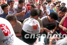 八月四日是2008北京奧運會徽揭曉后的第一天,大批市民一大早擁向北京百貨大樓搶購T恤衫、球帽等會徽紀念產品。中新社記者:張煒