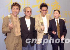 歌星許志安、蘇永康8月4日出席其《香港安康演唱會(huì)》記者會(huì),兩人獲經(jīng)理人黃柏高(左二)及演唱會(huì)主辦機(jī)構(gòu)老板張耀榮(右一)送上鉆石咪高峰造勢(shì)助慶。中新社記者:鄧慶樂(lè)