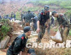 受熱帶風暴“莫拉克”影響,8月5日凌晨6時許,福建晉江市磁灶鎮東山水庫一外圍堤壩出現20米長的決口,由于水庫與下游農田有約20米的落差,下游的3個村莊、1萬多人口、1000余畝農田因此受到嚴重威脅。二千多軍民經過5個多小時的搶險奮戰,終于堵住決口。作者:徐承彬