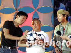 八月初,搜狐公司在北京朝陽公園舉辦“搜狐在線2.0,簡(jiǎn)單上網(wǎng)新生活”大型游園會(huì),眾多明星前來捧場(chǎng)。張朝陽和香港著名影星曾志偉(中)為網(wǎng)民簽名。中新社記者:張勤